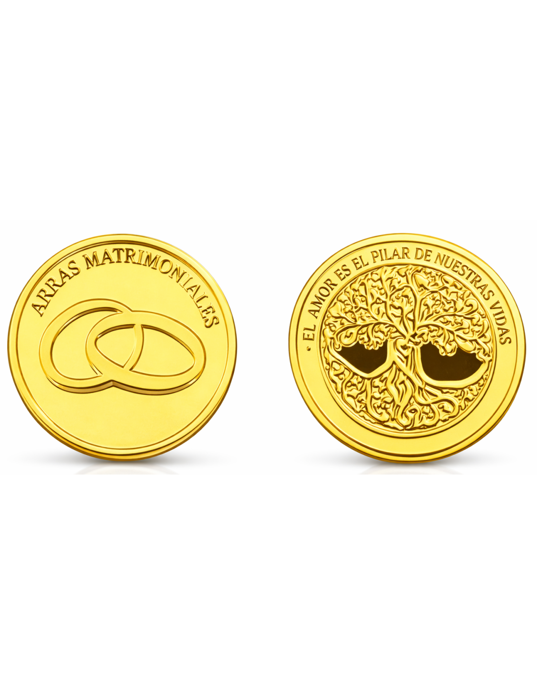 Arras de boda doradas con diseño elegante y simbólico, perfectas para ceremonias matrimoniales tradicionales. Estas arras presentan en una cara los clásicos anillos entrelazados junto a la inscripción “ARRAS MATRIMONIALES”, representando la unión eterna entre los novios. En la otra cara destaca un detallado Árbol de la Vida en relieve, acompañado del mensaje “EL AMOR ES EL PILAR DE NUESTRAS VIDAS”, un símbolo profundo de amor, crecimiento y estabilidad en el matrimonio.