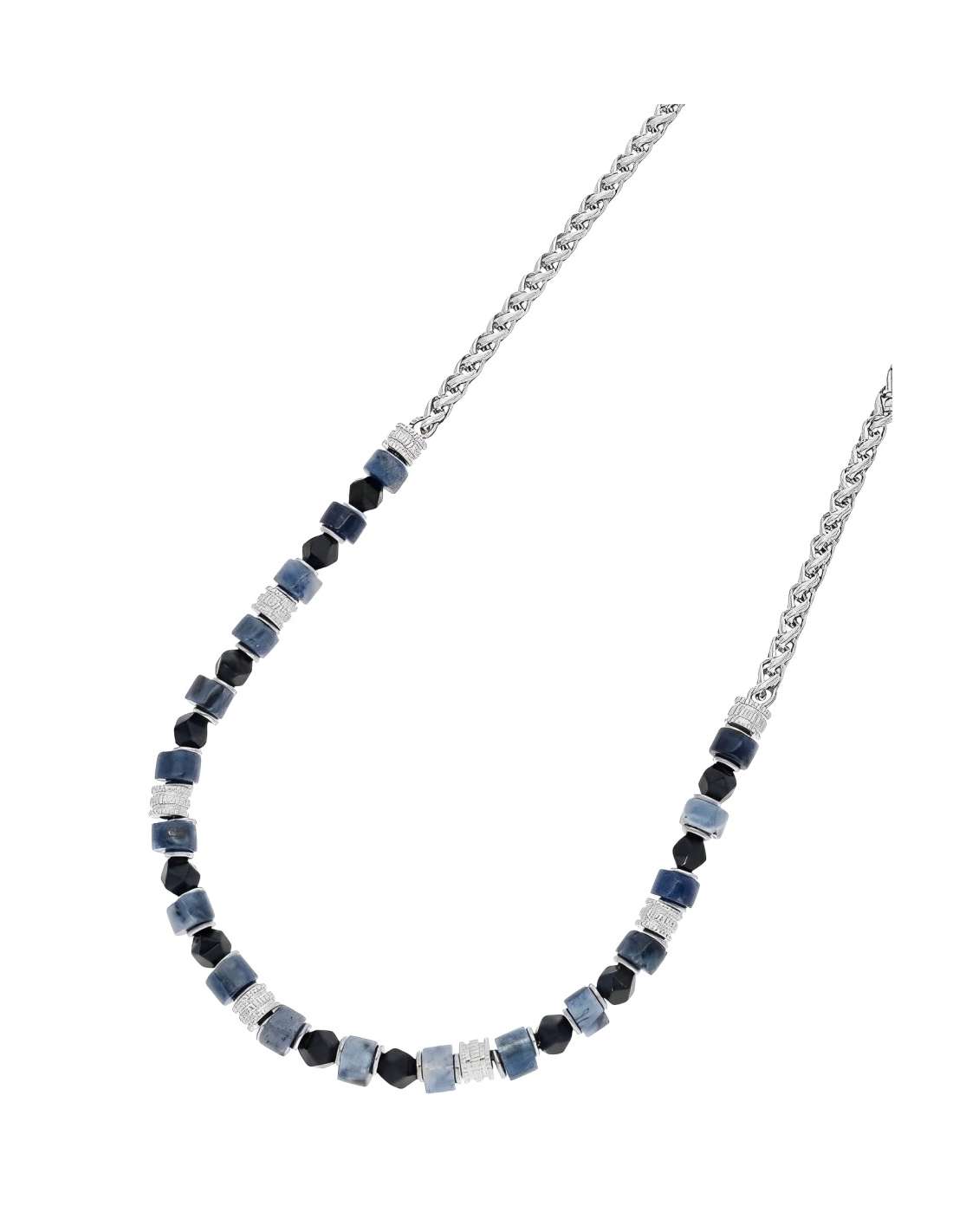 Collar Marea para hombre en acero inoxidable combinada con cuentas de piedras naturales en tonos azul y negro. Un diseño moderno y equilibrado que mezcla materiales nobles y estilo urbano. Ideal para quienes buscan un look actual con un toque distintivo.