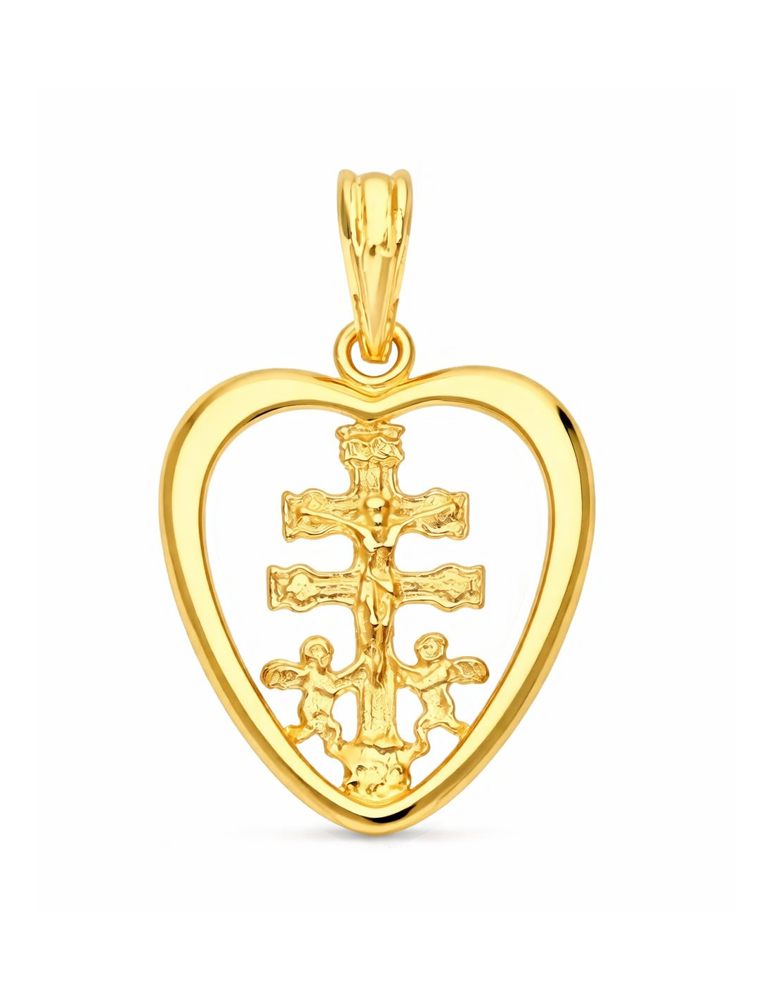 Colgante Cruz Caravaca con Cerco forma de Corazón - Oro Amarillo 18K