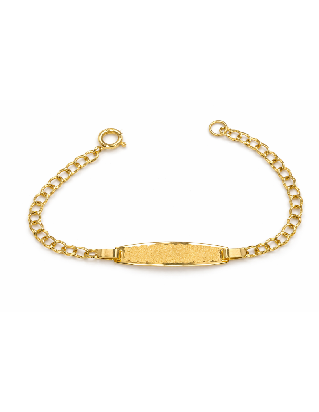 Pulsera esclava infantil elaborada en oro amarillo de 18 quilates, con elegante cadena milanesa y seguro cierre de asa. Su diseño fino y delicado la convierte en la primera pulserita ideal para el bautizo o como regalo de nacimiento. La placa central lisa permite personalizarla con nombre o fecha, creando un recuerdo único y especial.