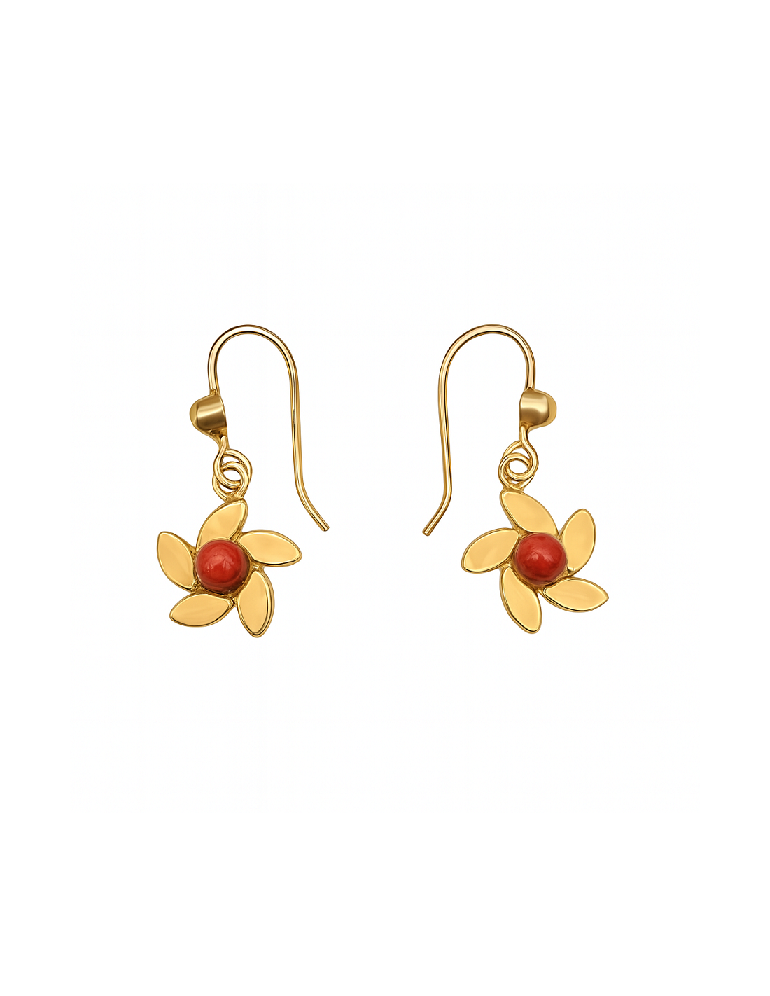 Pendientes largos elaborados en oro amarillo de 18 quilates, con un delicado diseño en forma de flor, realzado en el centro por una media bola de coral rojo natural, que aporta calidez y carácter a la pieza. Una joya que combina feminidad, naturaleza y distinción.