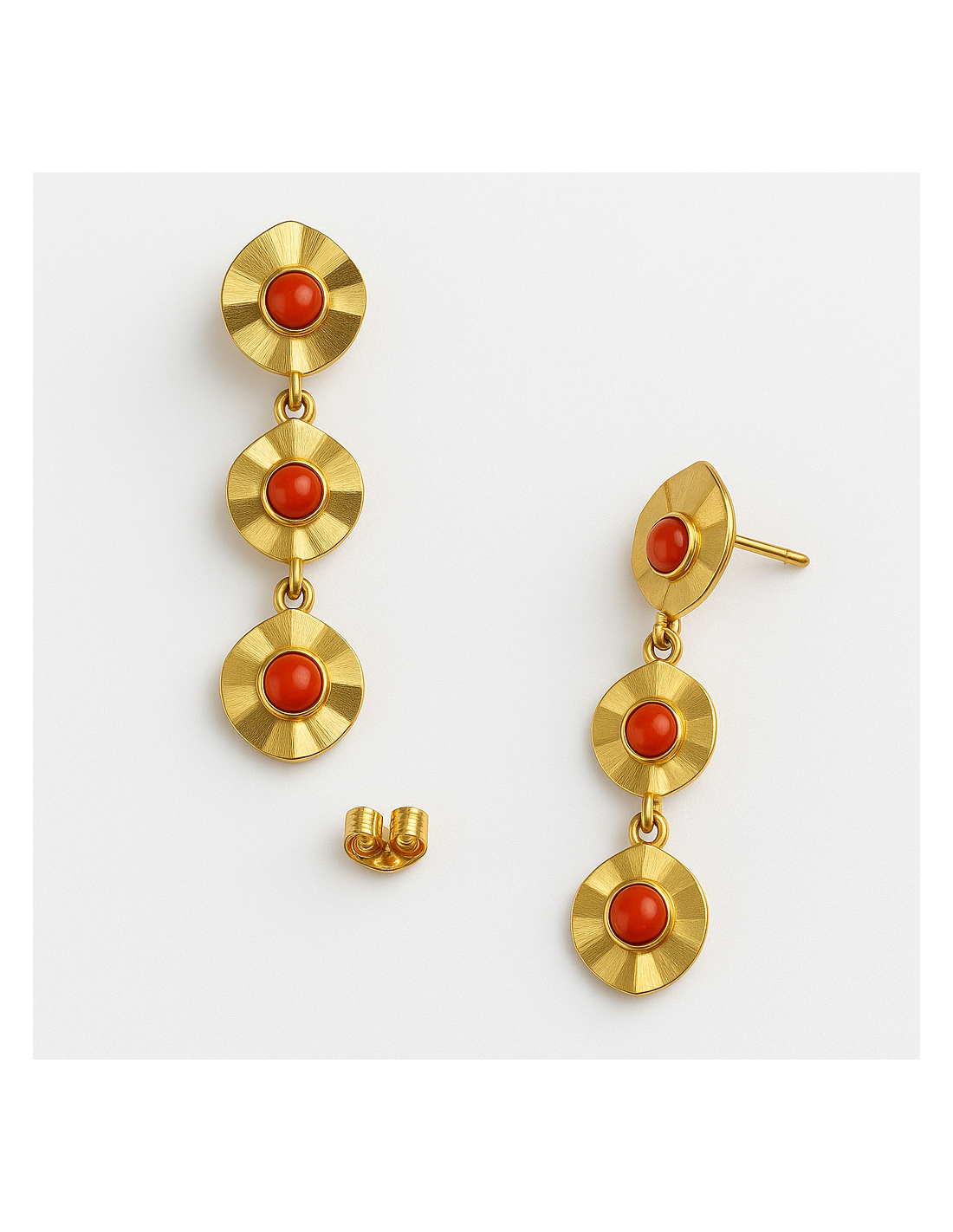 Pendientes Largos para Mujer en Oro con 3 Motivos Redondos de Coral – Estilo Clásico con Toque Natural