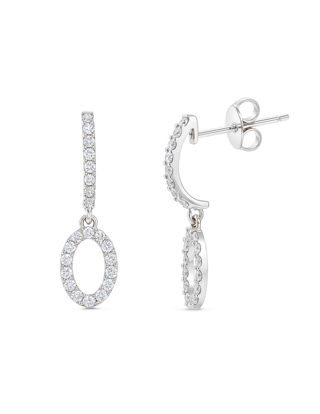 Pendientes largos diseñados especialmente para niñas, elaborados en oro blanco de 18 quilates, con una fina tira vertical que culmina en un elegante colgante ovalado. Engastados con circonitas brillantes, estos pendientes aportan un toque de distinción y ternura a cualquier ocasión especial.