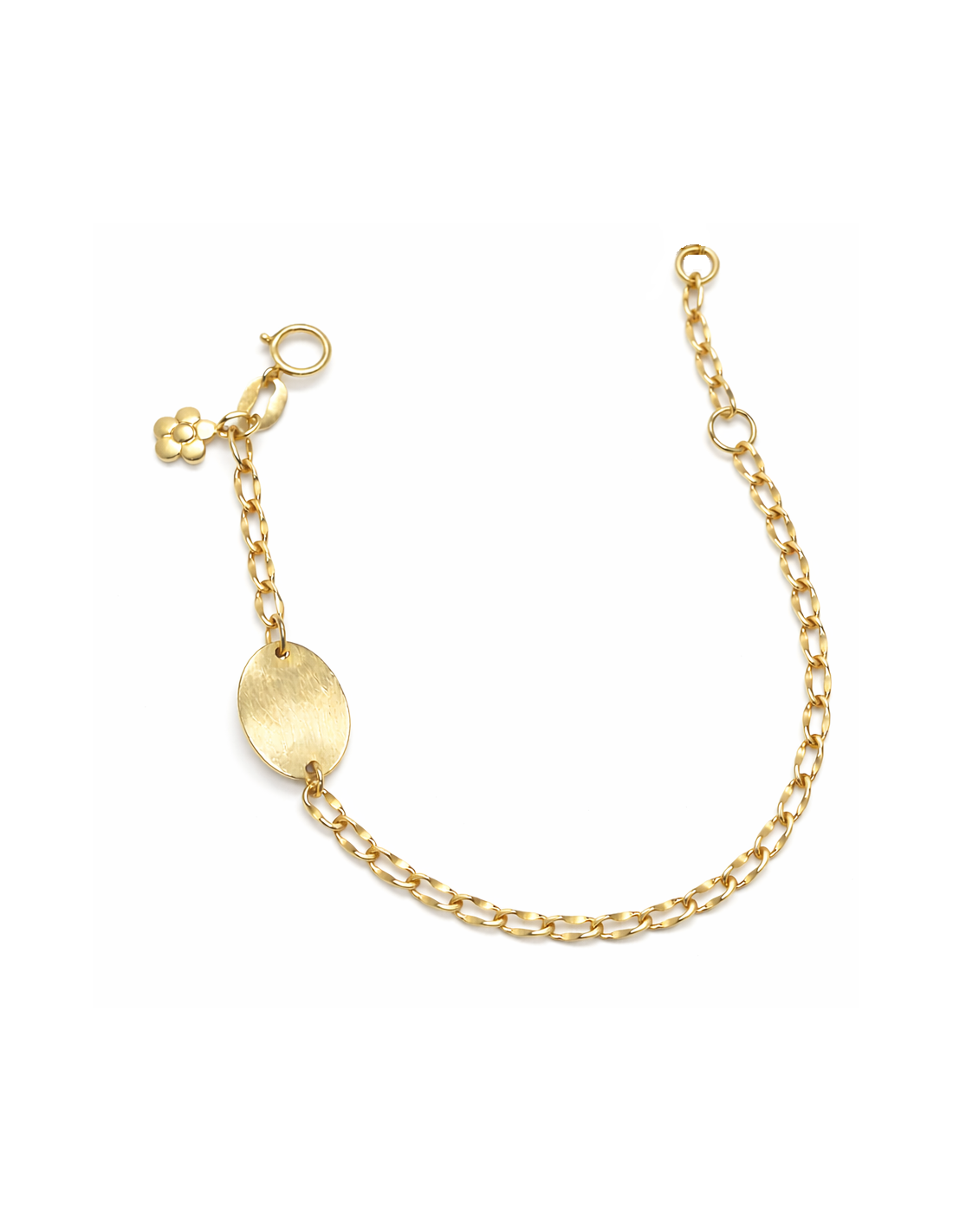Pulsera infantil con colgantes con Placa Ovalada y con Colgante Flor - Oro Amarillo 18K